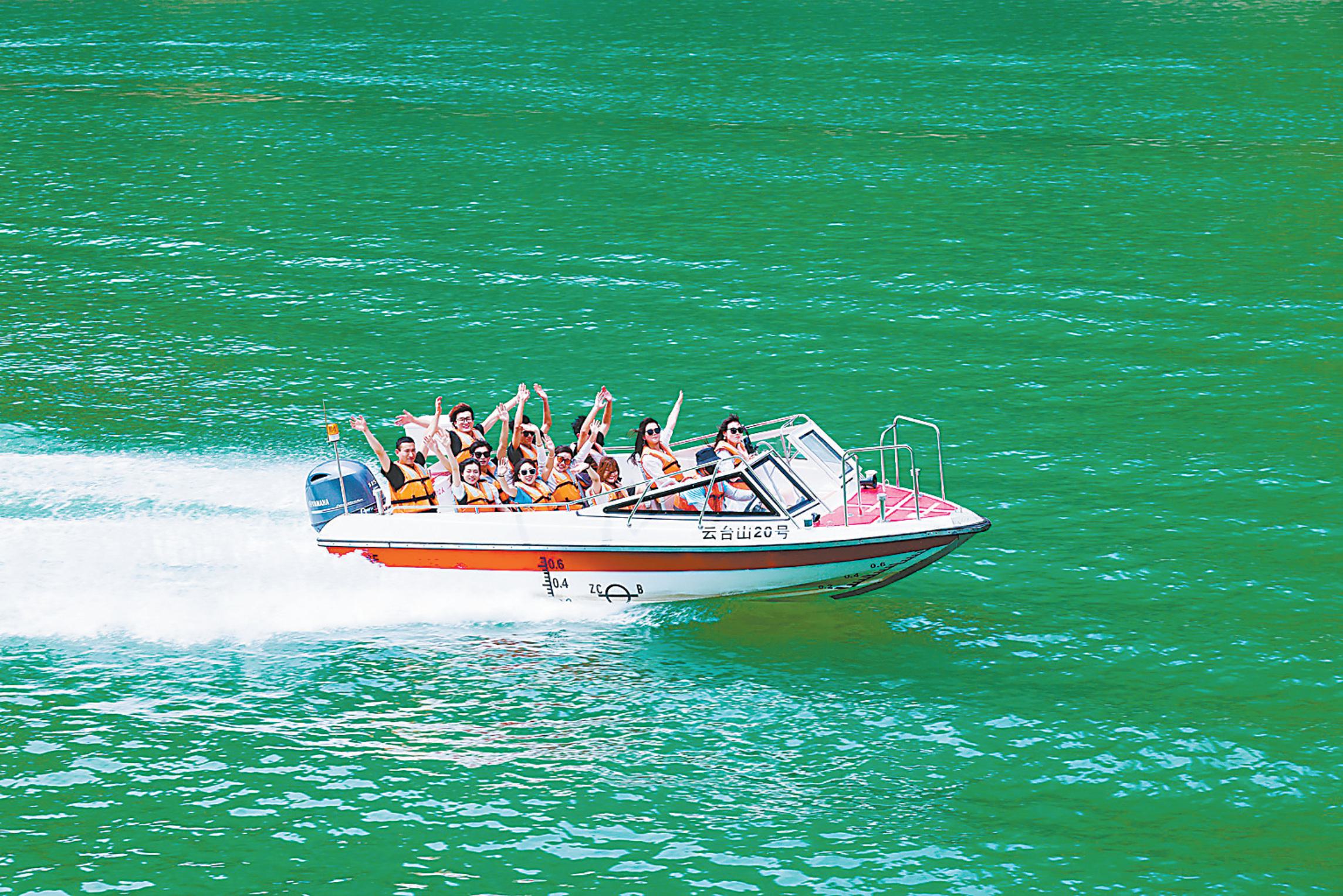 图④ 乘坐快艇驰骋在子房湖上,水花飞溅,欢乐无限。