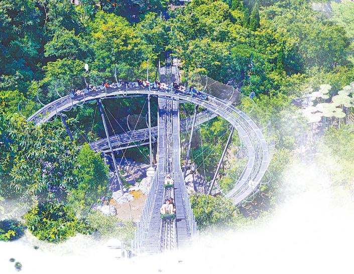 沿着山间小径来到猕猴谷,丛林滑道成为游客下山的热门选择。游客通过滑道,在丛林间飞驰盘旋而下,在享受速度与激情的同时,近距离感受大自然的生机与活力。